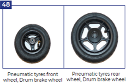 - Пневматические или полиуретановые колеса (литые) передние и задние колеса ) с ободами 6-спиц (47)