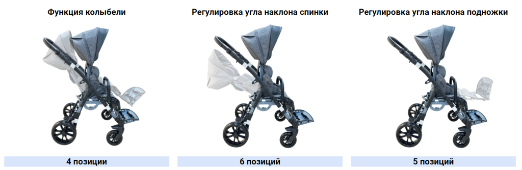 В стандартную комплектацию входит так называемая «колыбель» – возможность изменения угла наклона сиденья вместе со спинкой. Также спинку можно разложить в горизонтальное положение до 180°.