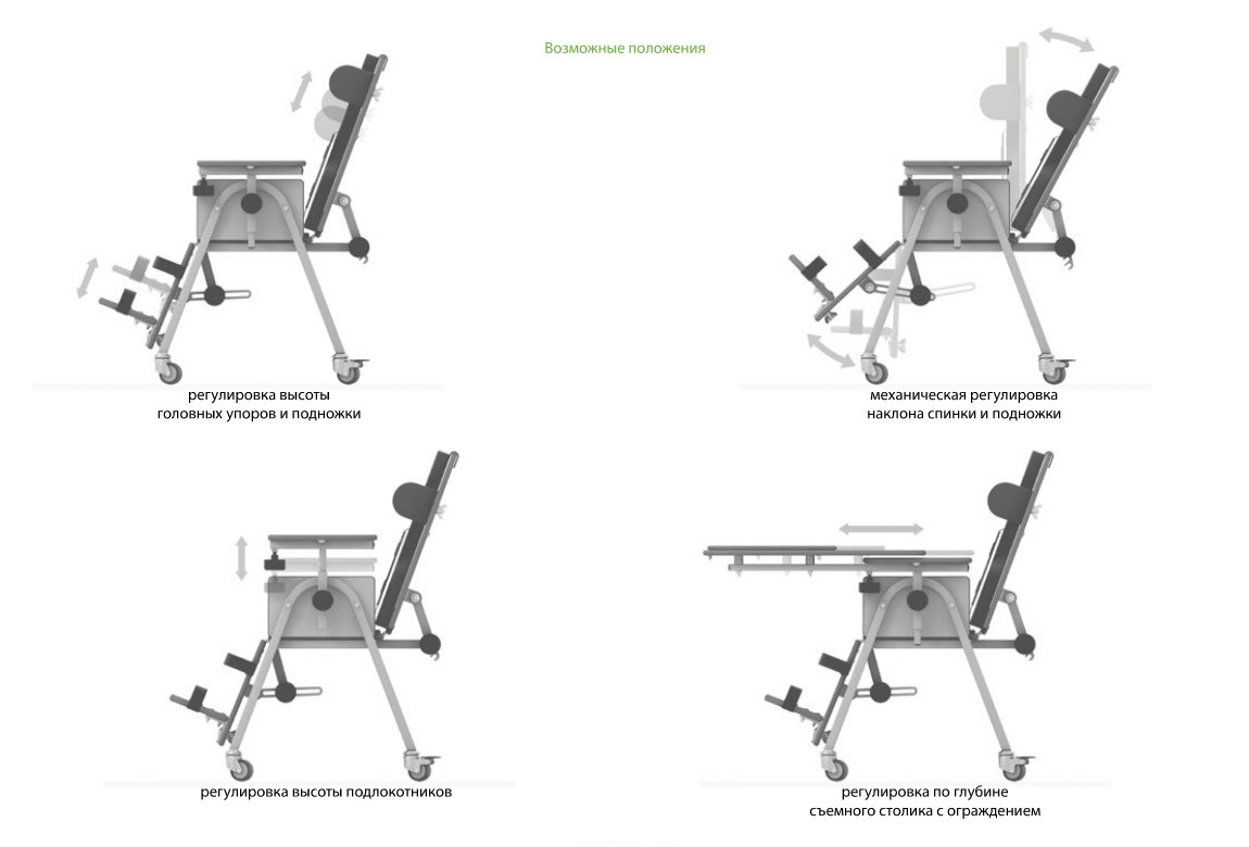 Регулировка положения стола, упоров головы, абдуктора, подножки и спинки