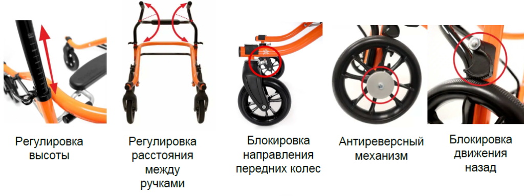 Ортопедические ходунки go.spider имеют функциональные передние колеса с возможностью блокировки направления движения, что даёт пользователю больший контроль во время движения.