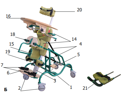 Опора функциональная для стояния для детей-инвалидов, представляет собой многофункциональное устройство - вертикализатор на металлической раме, позволяющий проводить вертикализацию ребенка в положении «лежа на спине» - с поддержкой сзади (использование в качестве заднеопорного вертикализатора), переводить из горизонтального в вертикальное положение с закреплением в любом промежуточном положении, используя пневмопривод, обеспечивая поддержку правильной позы и удерживание ребенка в необходимом положении по углу наклона.
